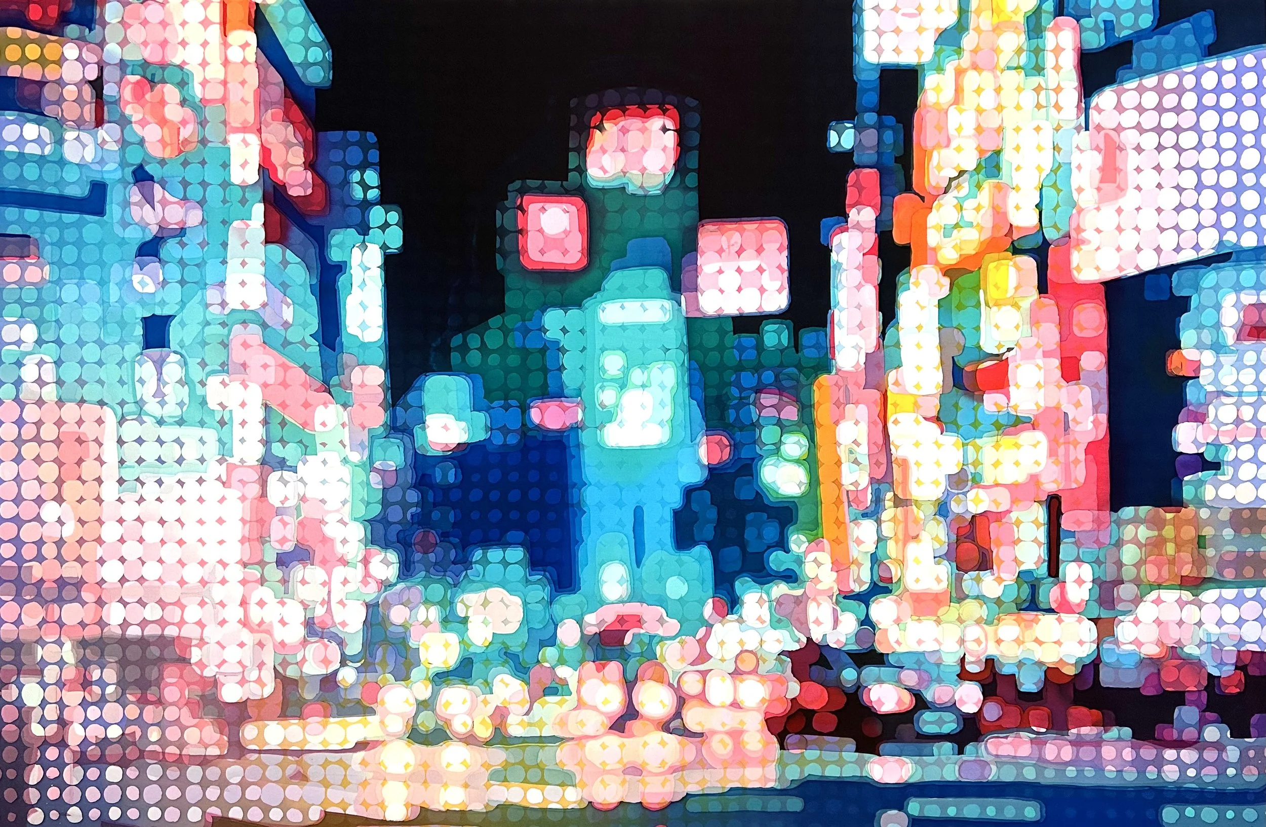 片山がモチーフとする風景は、都心の交差点だったり、太陽の光が降り注ぐ海岸線だったり、時には動物や草花をクローズアップしたもの等様々ですが、そこから彼が引き出す静謐な空気感と染め特有の雰囲気を上手く交わらせることで、既視感のある日常の側に潜む気持ち良い瞬間にリンクするよう描いています。片山は、「Chill」という一貫した自身の作品テーマを掲げ、観る者が現実から離れて自身と向き合い、心を落ち着かせるための役割を持たす事を目指しているのです。また、近年の特徴の一つとも言える、作品中に散りばめられている点(ドット)は、蝋を用いてフリーハンドで描いた痕跡による図柄です。単純な行為の蓄積でありながらも、モチーを干渉しない絶妙な間隔で並べられることにより、心地良い時の経過が感じられ、大小やドット自体の色彩に変化をつけることによって、感情の振れ幅と視覚的な効果がより強く感じられるよう工夫されています。