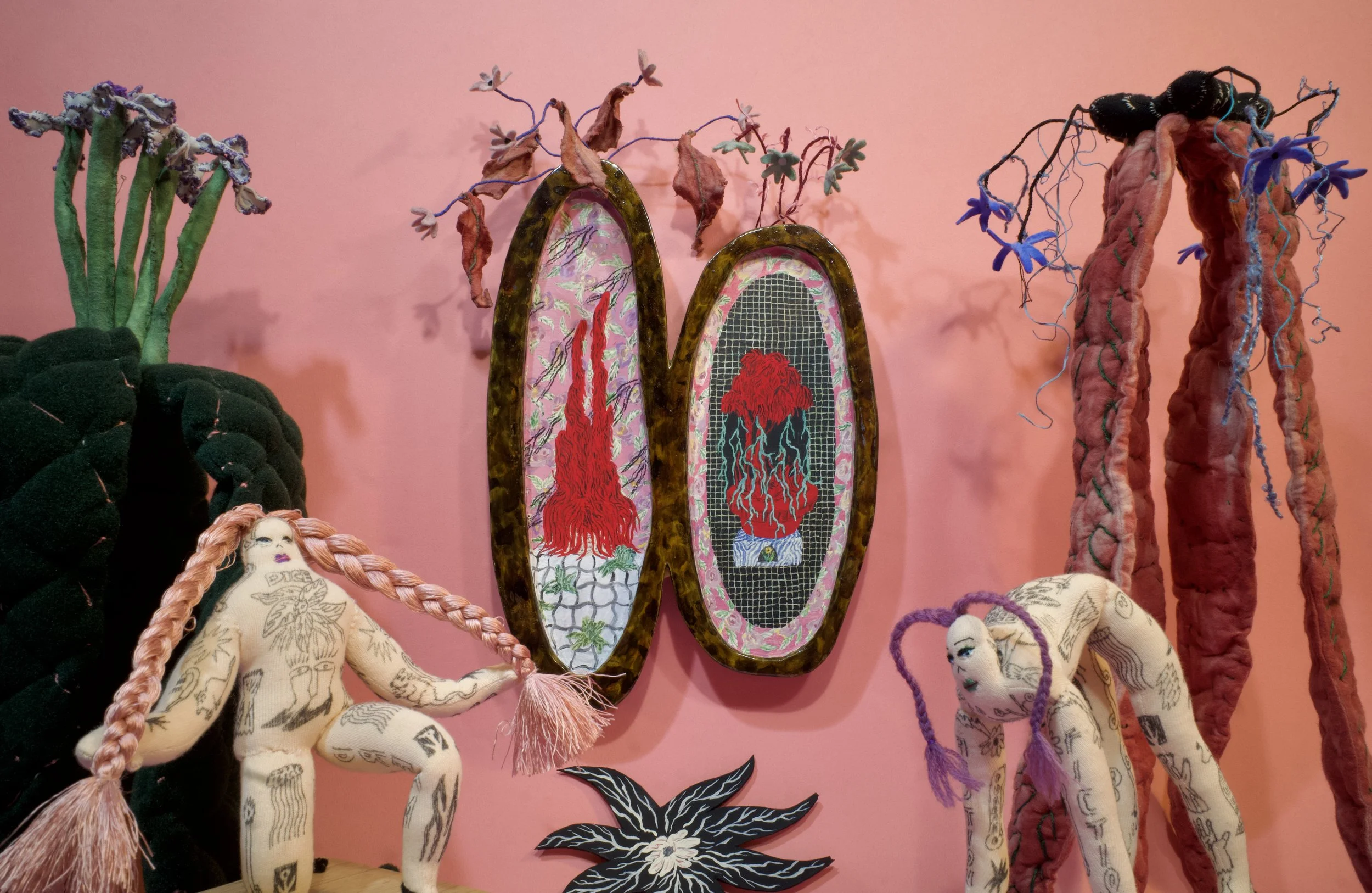 どことなく曖昧で、可愛らしくもパンキッシュな印象を持つ大原の作品は、一見描かれているように見受けられるモチーフが、実はレリ ーフのように浮き彫りにされていたり、背景の柄が刺繍であったりと、作品の至る所に彼女のこだわりが散りばめられています。様々な 素材と技術を用いながら、豊かな色彩と独自のタッチで表現される、不思議でポジティブな世界観が大変魅力的だと言えるでしょう。