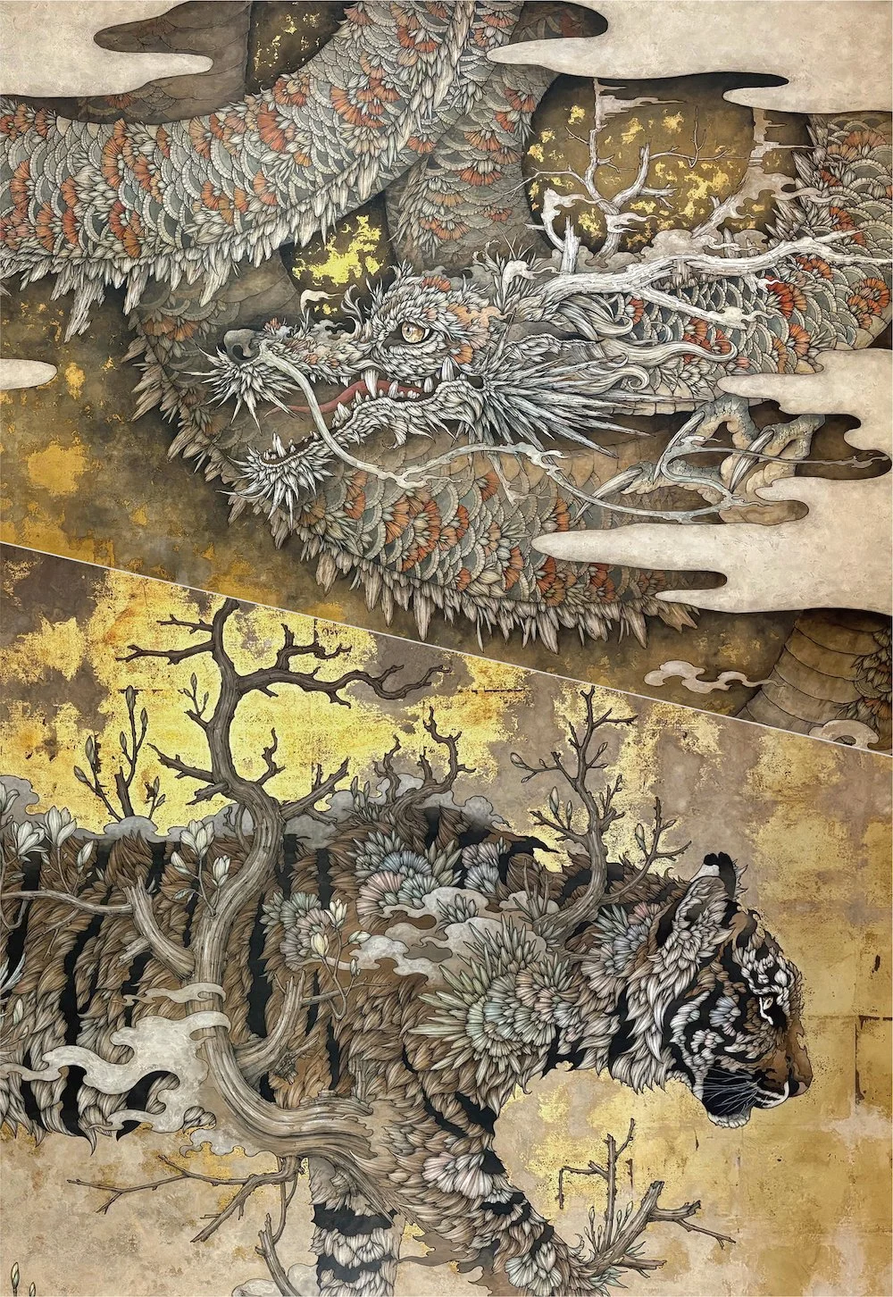 これまでと変わらない遠藤作品の根底にあるテーマを軸に、本展「Spirits Planter VII ただ、そこにいるだけ」では、自然の中にいる神的な存在に着目します。今回のメインとなる作品「ただ、そこにいるだけ 天」と「ただ、そこにいるだけ 地」には、それぞれ龍と虎が大胆に描かれていますが、竜虎相搏のように互いを意識しているわけではなく、より雲や木々のような自然に近い佇まいが印象的です。動物が持つ感情的なものを敢えて表現せず、周りで起こる全ての事は、何事も取るに足りないと言わんばかりの、無の境地に至っているかのような雰囲気が醸し出されています。
